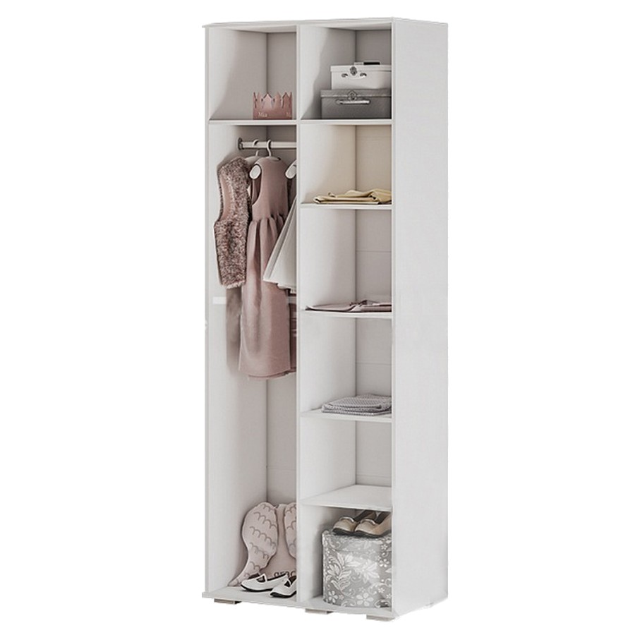 Двухстворчатый шкаф для одежды "Трио" имеет 2 отделения. Плательное отделение оснащено хромированной штангой овальной формы и антресольной полкой. Второе отделение шкафа комплектуется полками.