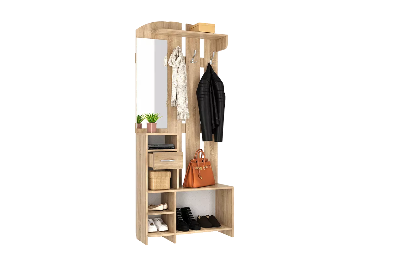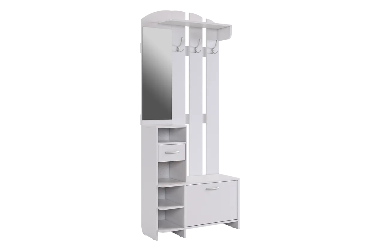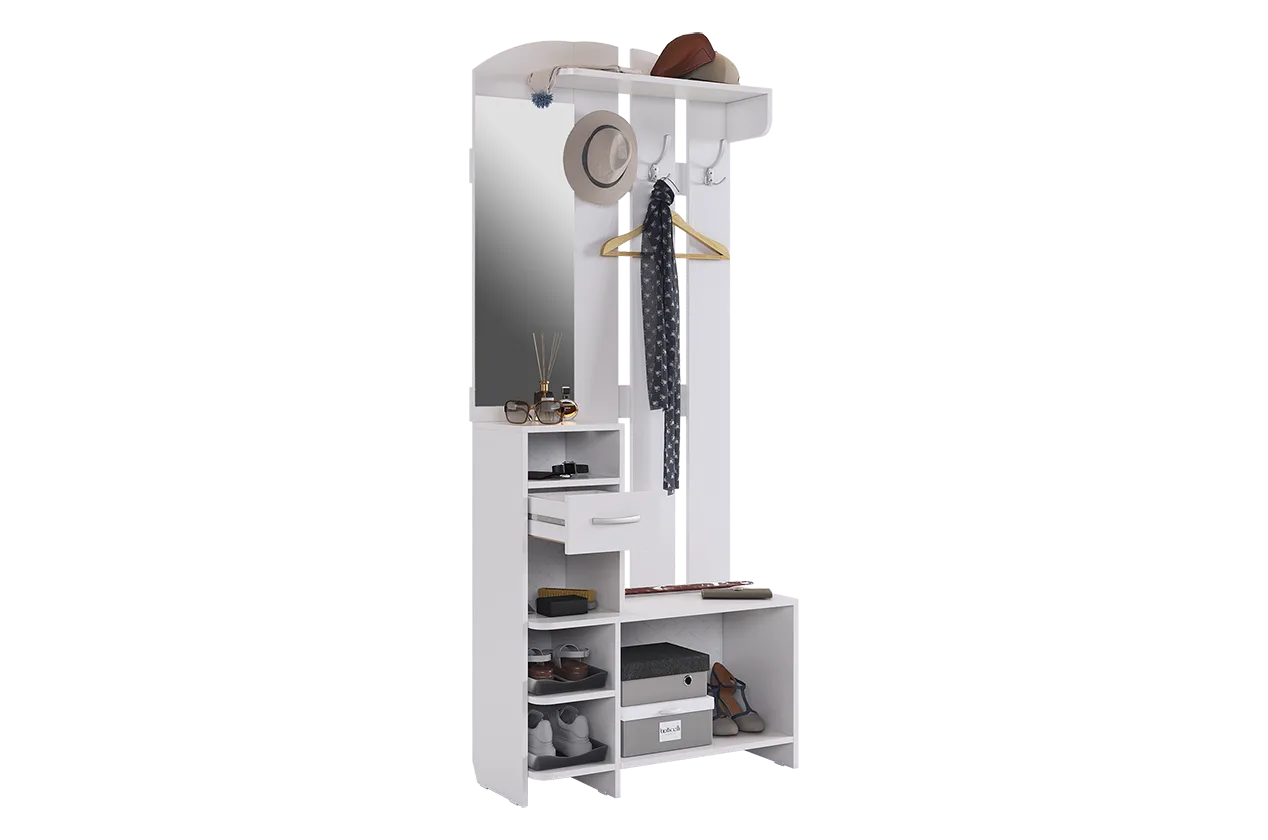 • Прихожая Мила: эффективное решение для оптимального использования пространства, сочетающее в себе открытую вешалку с крючками, место для обуви, компактное зеркало и удобный ящик с полочками для всевозможных мелочей.
