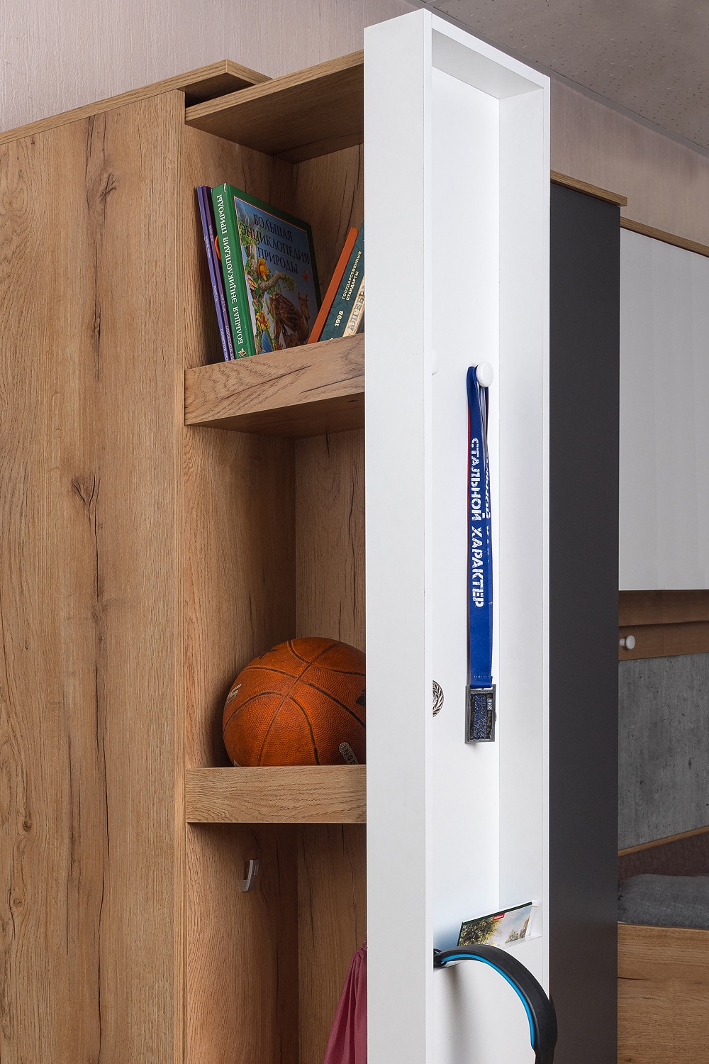 Выдвижной шкаф МЦН имеет две зоны хранения: закрытую зону и открытую с карманами. Наполнение шкафа, комплект полок с ограничителями и ниша с крючками, идеально подойдет для хранения вещей в сложенном виде. Канцелярские предметы, книги и предметы декора Вы сможете расположить на самом фасаде.