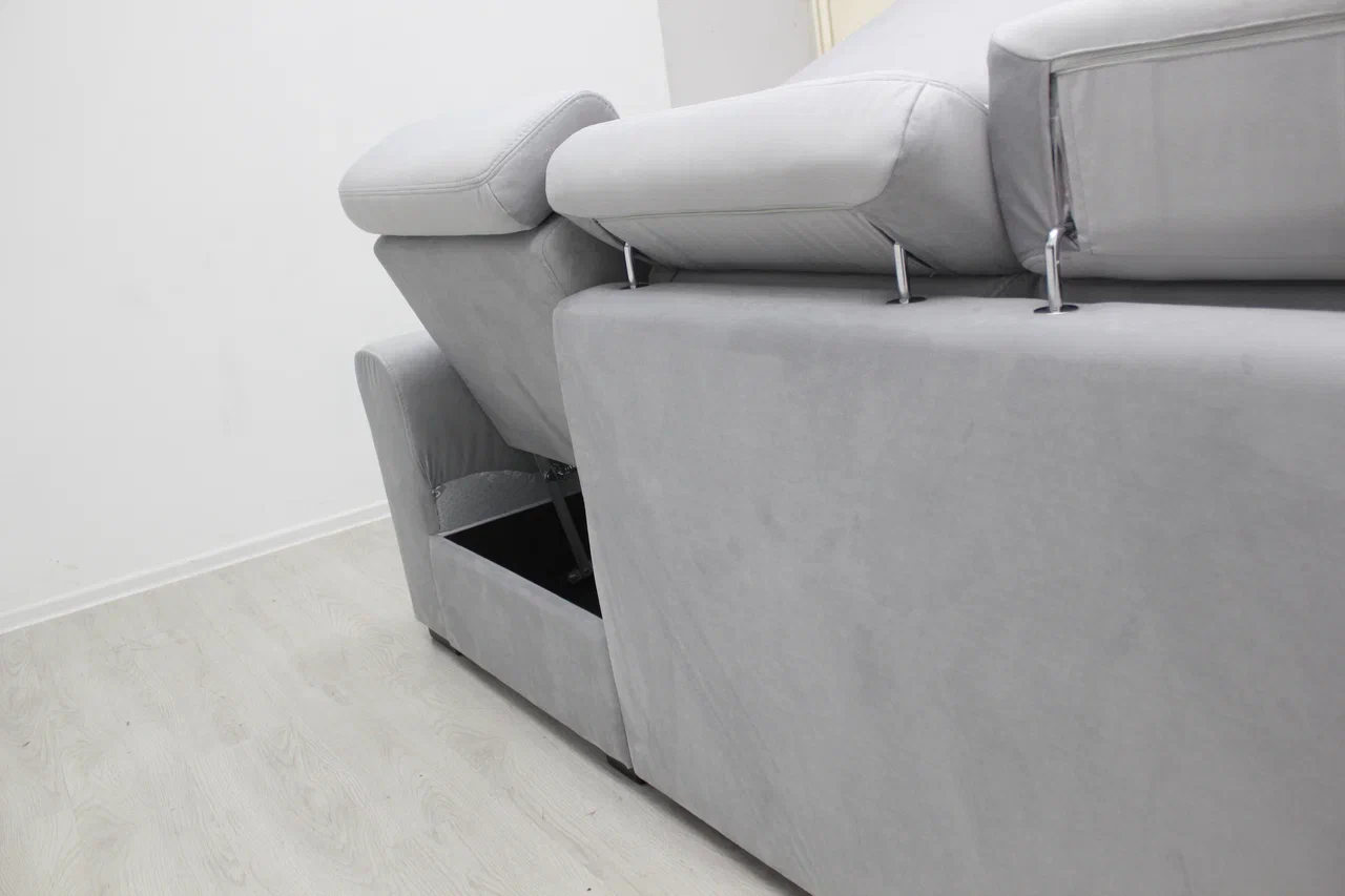 Оттоманка углового дивана имеет подъемный механизм, вентиляционное отверстие для поступления воздуха, расположенный в ящике для белья, находящемся под основанием оттоманки.