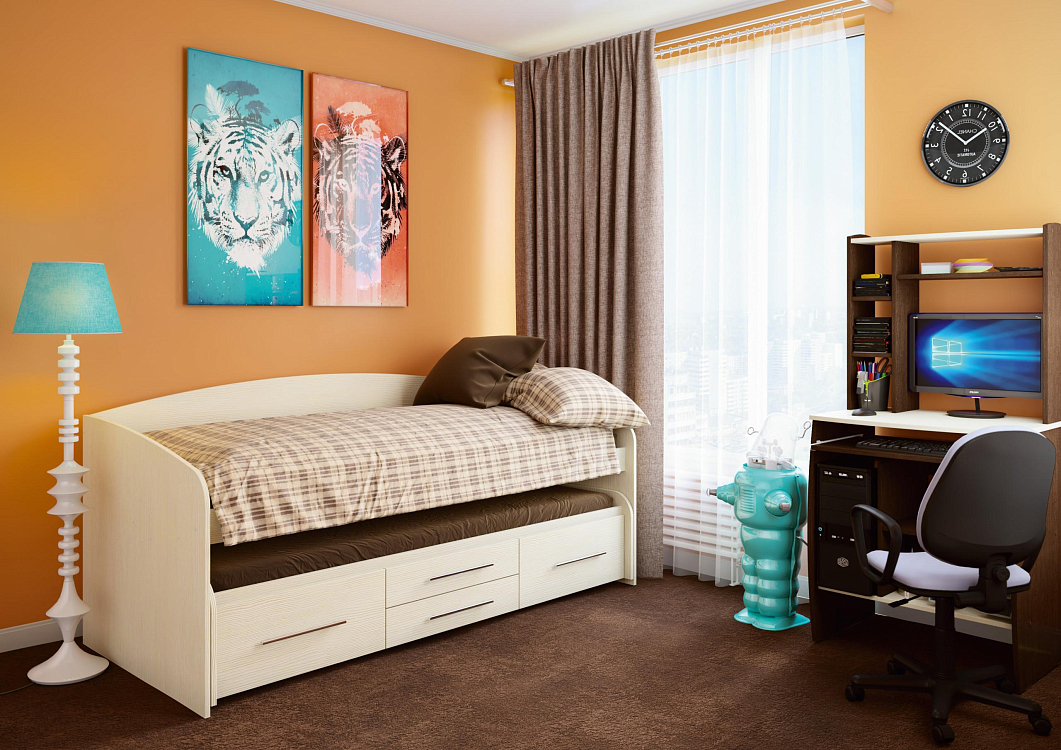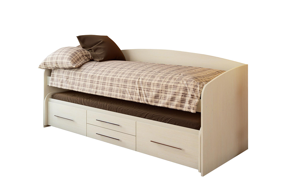 Двухъярусная кровать «Адель-5» имеет весьма необычную компоновку. У неё выдвижное нижнее спальное место, благодаря чему общая высота кровати составляет всего 66 см. Нижний блок оснащён двумя большими выдвижными ящиками, а так же одним малым выдвижным ящиком посередине для постельных принадлежностей, а также колёсиками, поэтому для его выдвигания вам не потребуется значительных усилий. Кровать оборудована боковинами и задней спинкой.