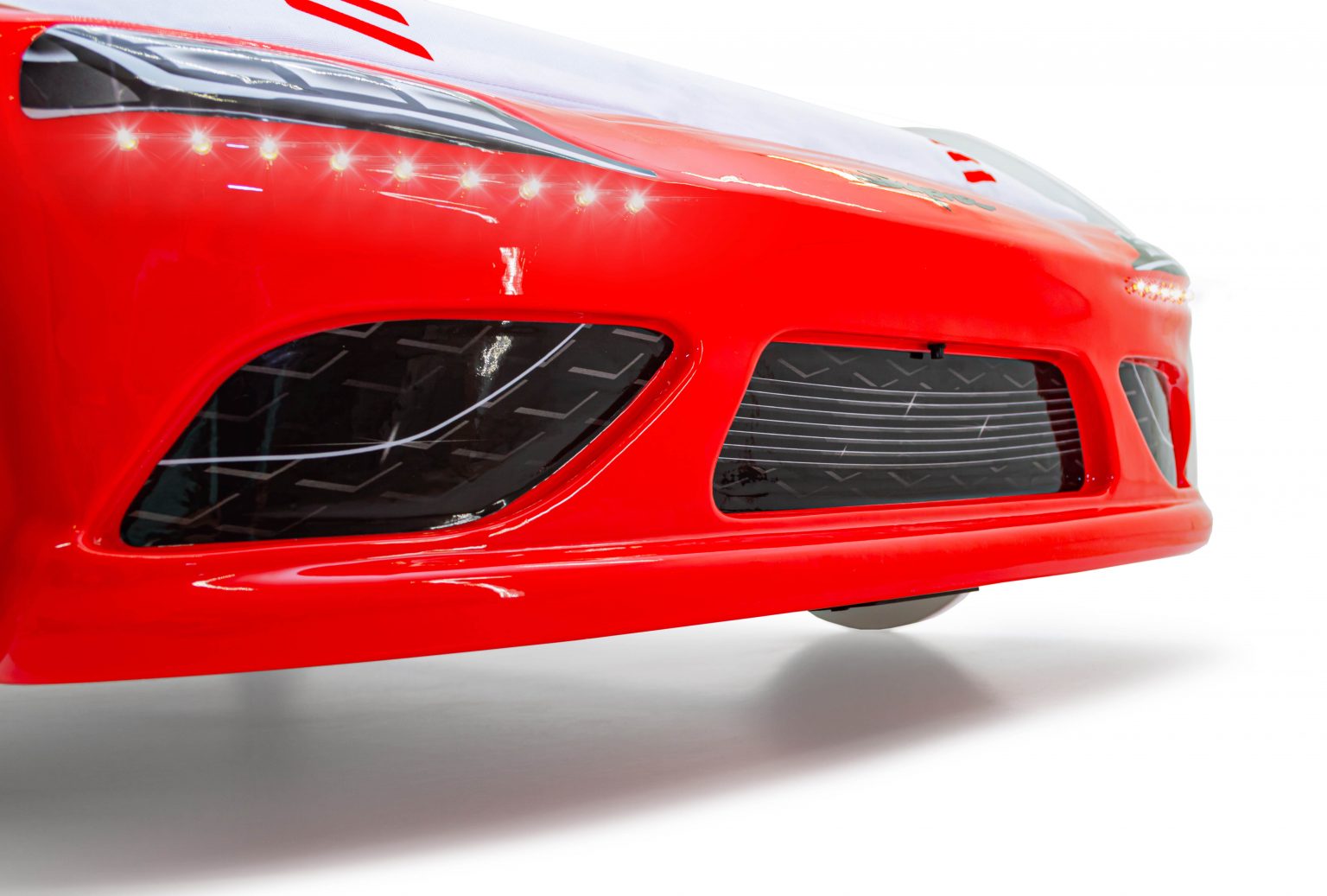 Каркас кровати выполнен из экологичного ЛДСП класса эмиссии Е1, соответствует всем стандартам качества. Кровать оборудована объемным бампером из ABS-пластика, к нему прилагаются наклейки в виде фар, радиаторной решётки и логотипа автомобиля. Все края кровати покрыты кромкой ПВХ 1 мм и безопасны для малышей.