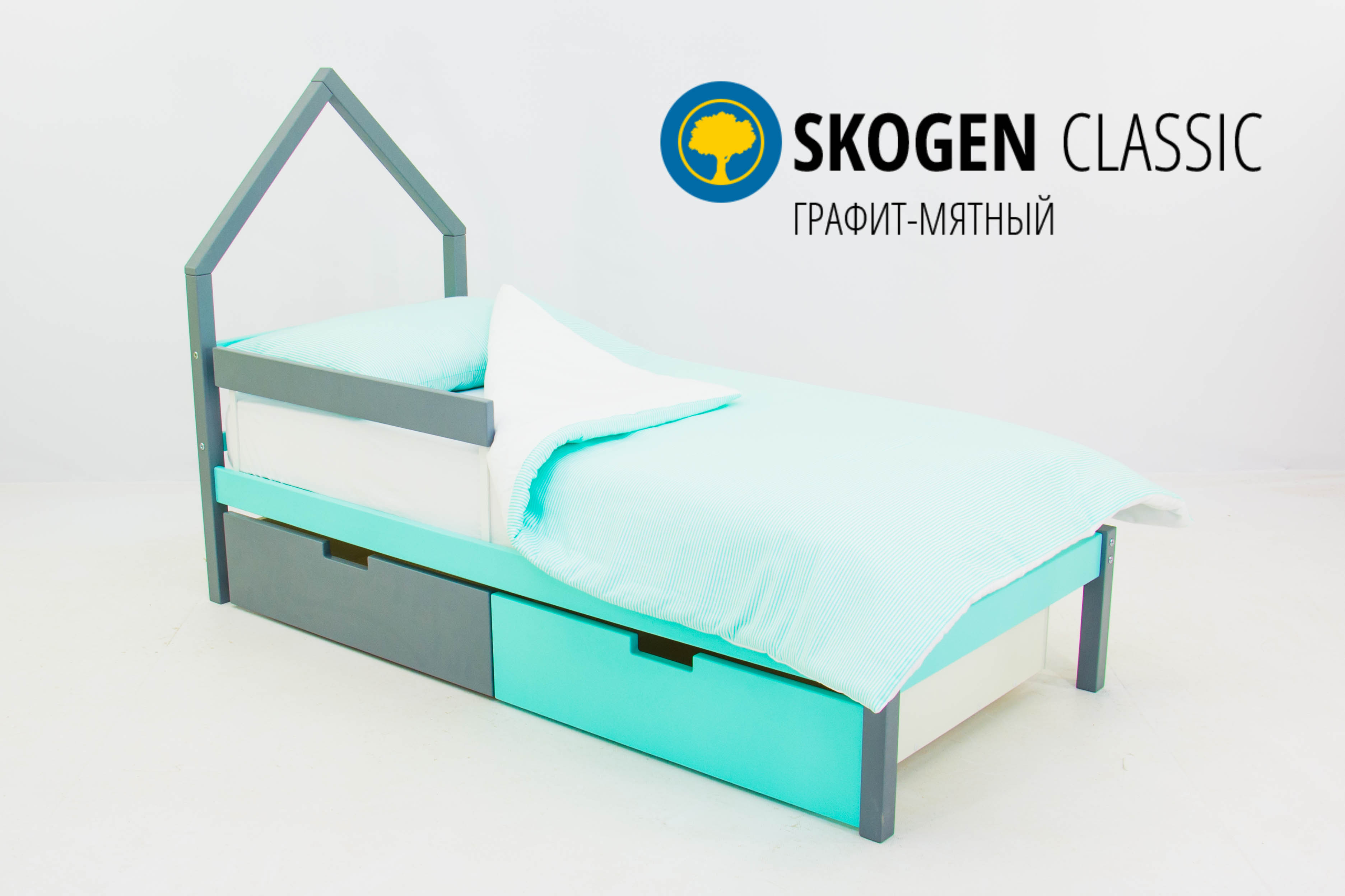 Экологически безопасный материал из натуральной сосны, соответствующий всем ГОСТовым нормам, не только безопасен для ребенка, но и отличается долговечностью, прост в эксплуатации и влагостоек, а дополнительный низкий бортик не только не даст маленькому непоседе выпасть из кроватки во время сна, но и позволит ему самостоятельно забираться в кроватку. Снизу могут располагаться два вместительных ящика для размещения постельного белья или же детских игрушек (комплект ящиков является дополнительным аксессуаром и не входит в стандартную комплектацию). Кровать-домик мини «Skogen дерево-белый» оснащена простой инструкцией по сборке, которую можно осуществить в течение 10 минут.