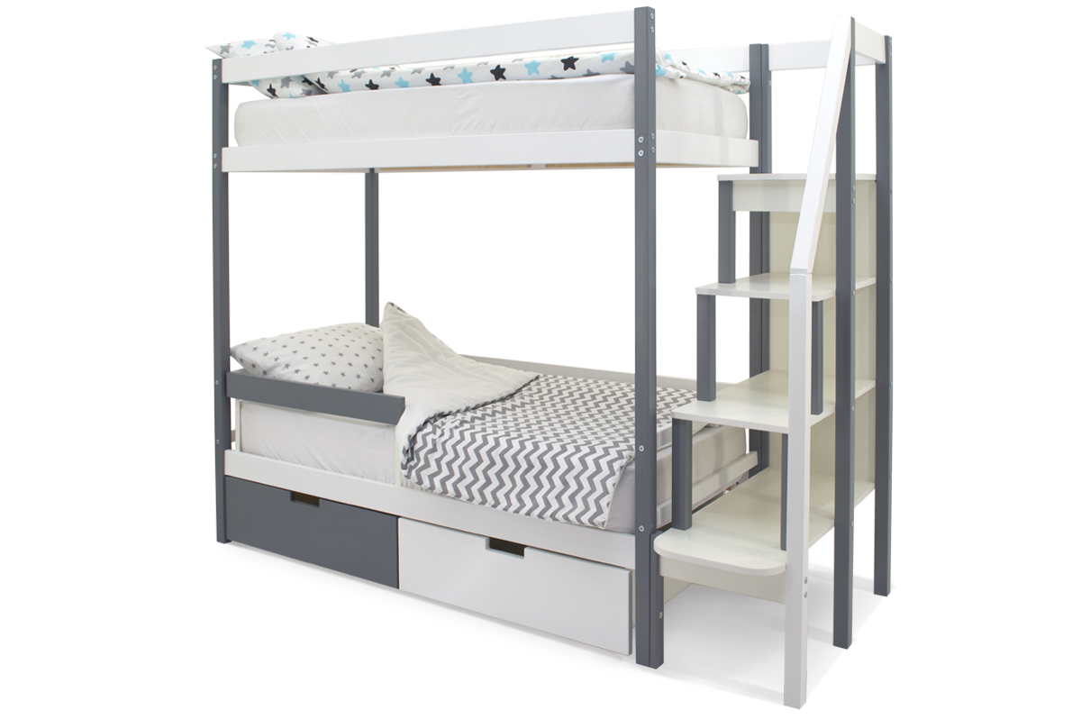 Благодаря своей конструкции, при которой оптимальна высота между ярусами и ширина спальных мест, кровать комфортна и удобна для сна и игр. Лестница и ящики под кроватью – это отличные места для хранения любых вещей.
