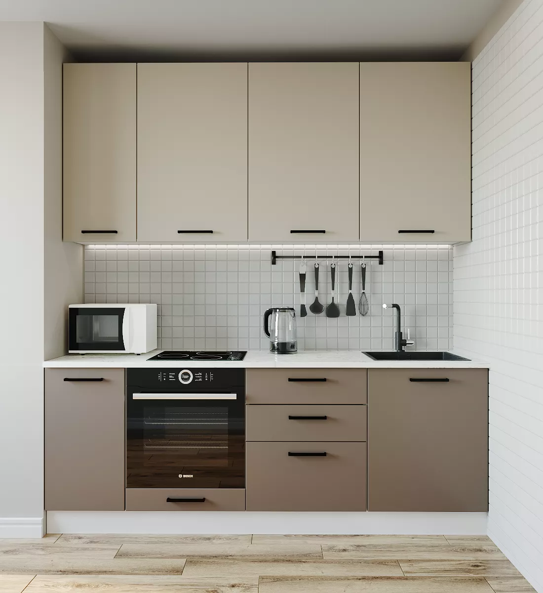 Фасады верхних модулей со свесом 12 мм дают возможность использовать без установки ручек.
