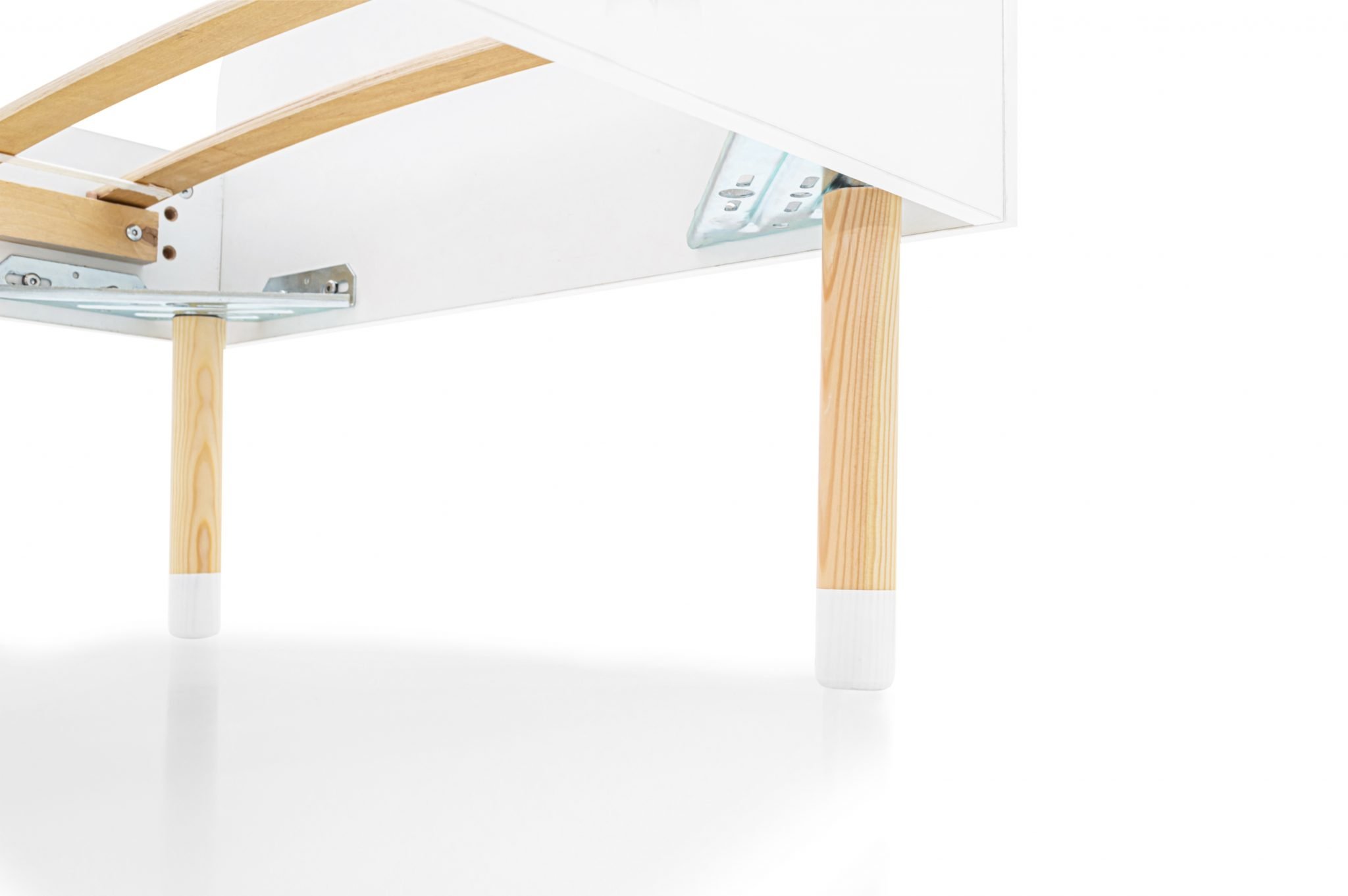 Кровать изготовлена из ЛДСП класса Е1, а ножки изготовлены из массива сосны, отшлифованы и покрыты лаком на водной основе. Эти материалы обладают высокой прочностью, долговечностью, просты в уходе.