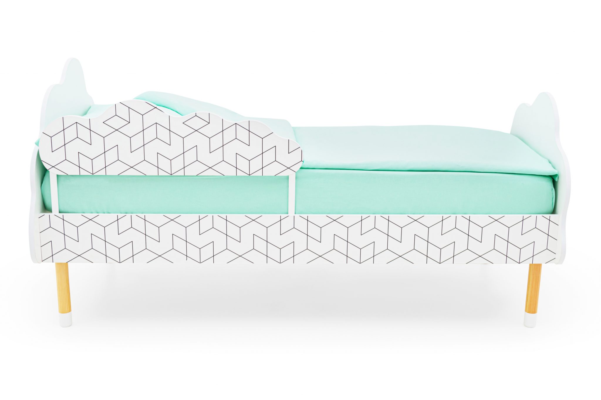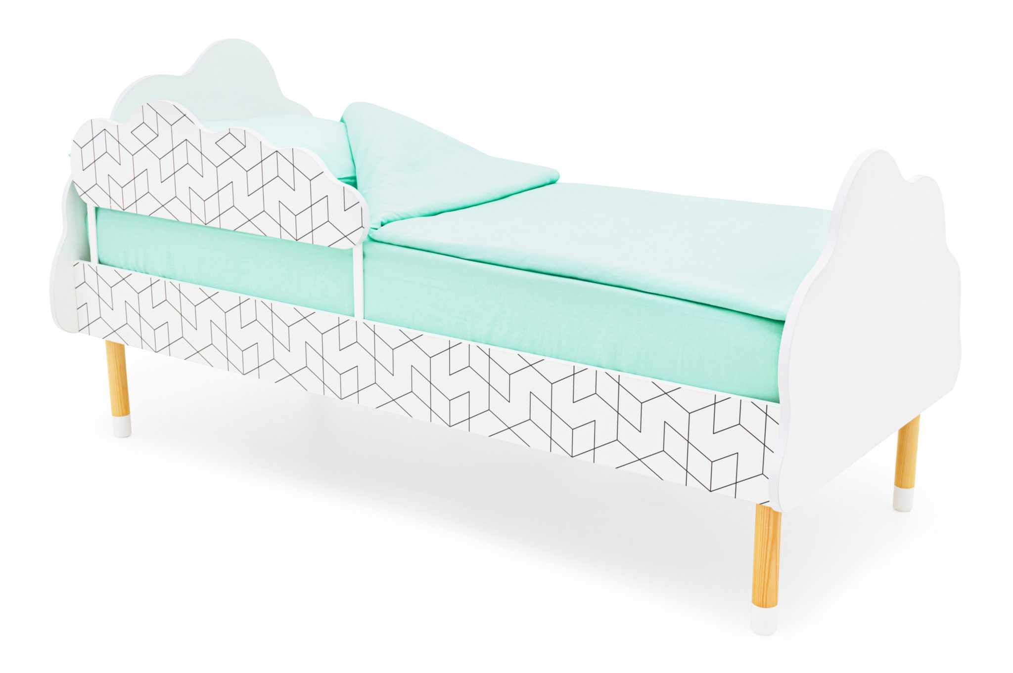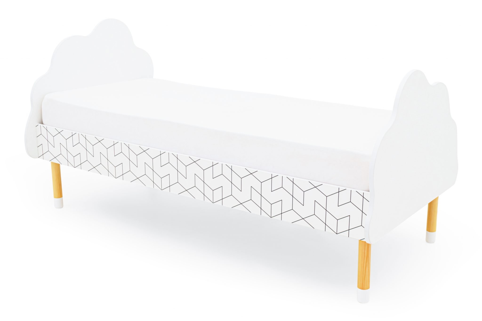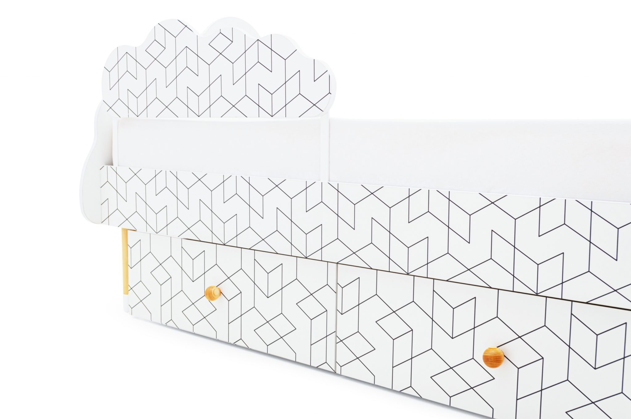 Изголовье и изножье кроватки сделаны в виде облака. Высота от пола до самого высокого места составляет 66 см. Это позволяет даже маленькому ребенку комфортно забираться и спускаться с нее, не рискуя упасть. Специальная конструкция кровати позволяет с лёгкостью присесть или прилечь рядом взрослому, если ребенок не может заснуть.