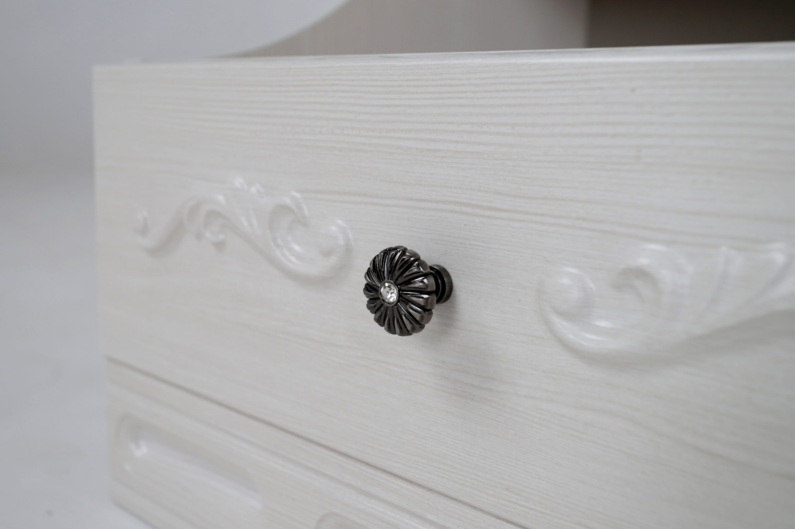 Тумба из серии «Мария-Луиза» прекрасна во всех отношениях: привлекательный цвет, необычная форма, резные узоры и милейшая фурнитура.