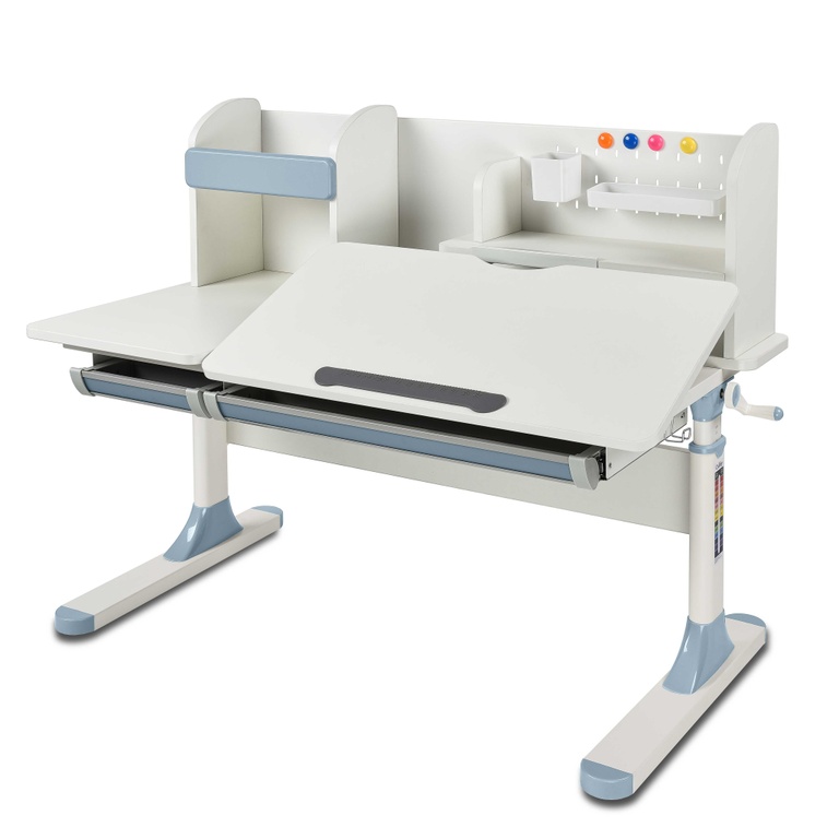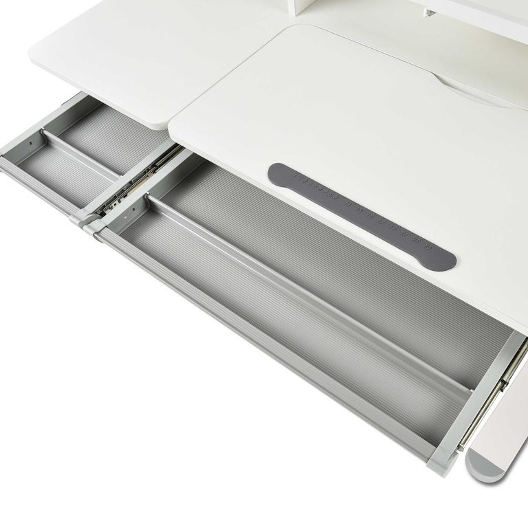 Столешница парты имеет две зоны, рабочая (наклонная) и статичная. Особенностью рабочей зоны является возможность менять наклон поверхности. В то время как на статичной части можно разместить лампу, книги и предметы канцелярии.