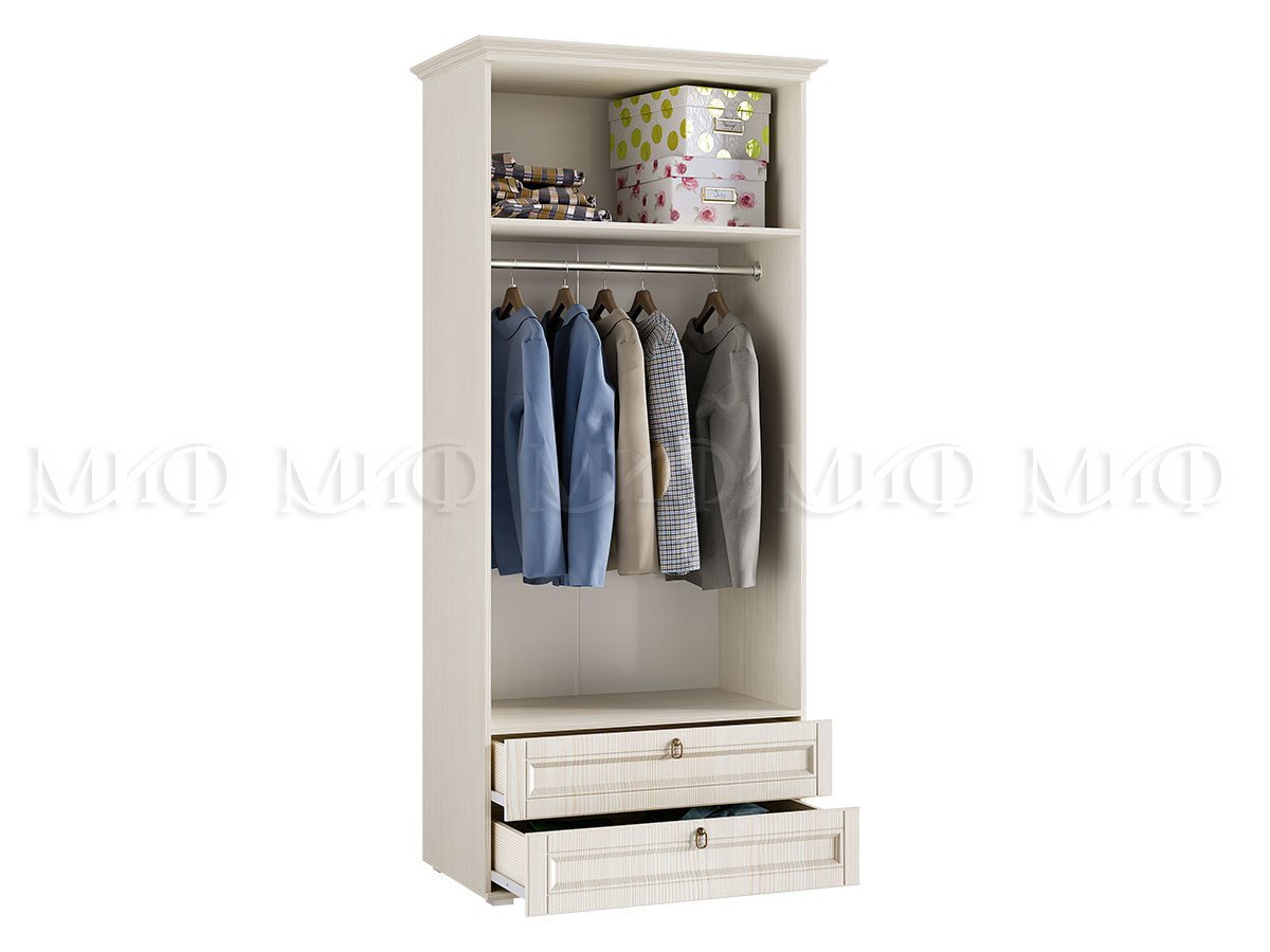 Элегантный двустворчатый шкаф с двумя вместительными выдвижными ящиками в основании и со штангой и антресольной полкой за двумя распашными дверцами, декорированными лаконичной фрезеровкой. В основании шкафа - низкие опоры. Карниз входит в комплект.