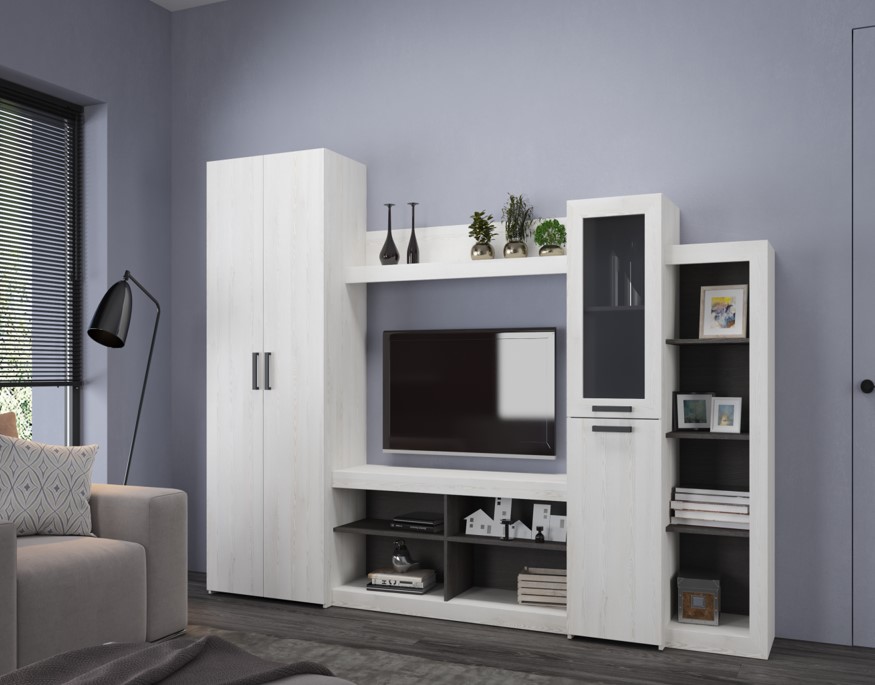 Вместительная стенка для небольших помещений. В гостиной «Oskar -4» предусмотрено: пенал, со стеклянной и глухой дверью, пристройка с открытыми полками, для хранения мелочей, бумаг, книг. Место для телевизора и аппаратуры. Полка для сувениров и фотографий. Плательный шкаф для хранения вещей на выдвижной штанге и на полках. За счет уменьшения высоты у пенала и пристройки, стенка имеет более облегченный вид.