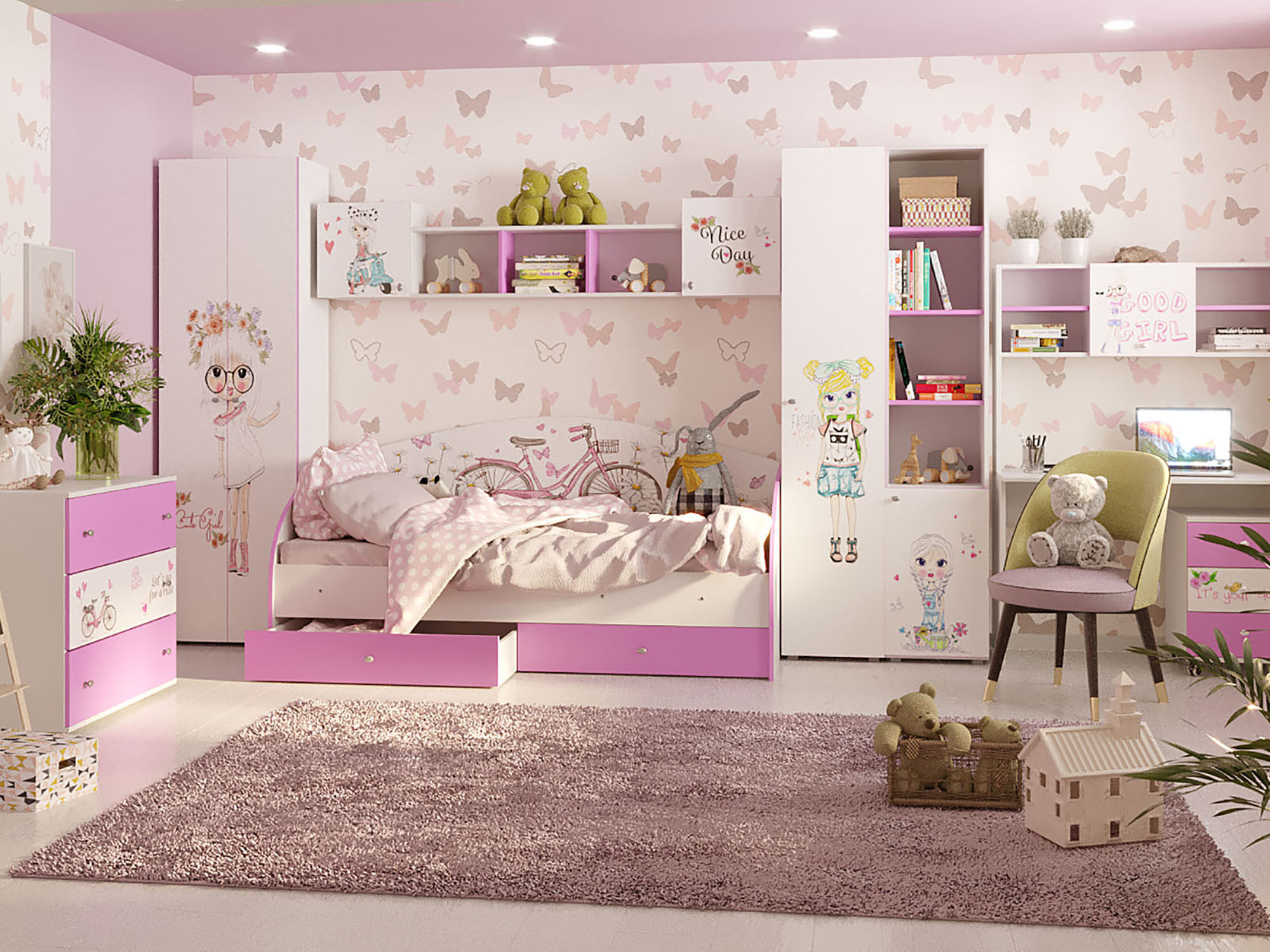 Модульная детская «Аннет» — идеальное решение для комнаты девочки. Многофункциональная, практичная, позволит разместить все необходимые вещи. Фотопринт обогатит интерьер и придаст настроение детской комнате.