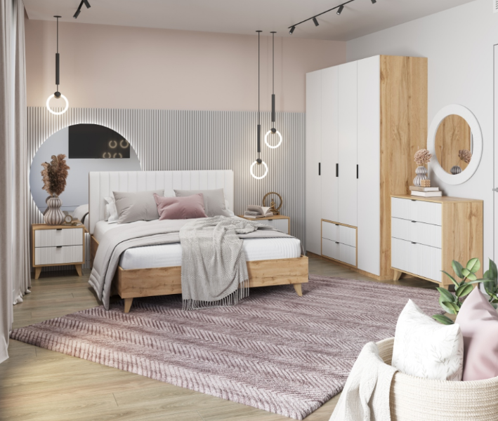 Спальня “Лаура” удивляют сочетанием стильного дизайна и непревзойденным уровнем функциональности. Элегантная и изящная мебель Лаура выполнена в скандинавском стиле. Фрезерованный белый матовый фасад в сочетании с корпусом «Дуб вотан» добавит интерьеру тепла и уюта, а строгие прямые линии подарят ощущение спокойствия и умиротворения. Спальня “Лаура” удивительно преобразит интерьер вашего дома.