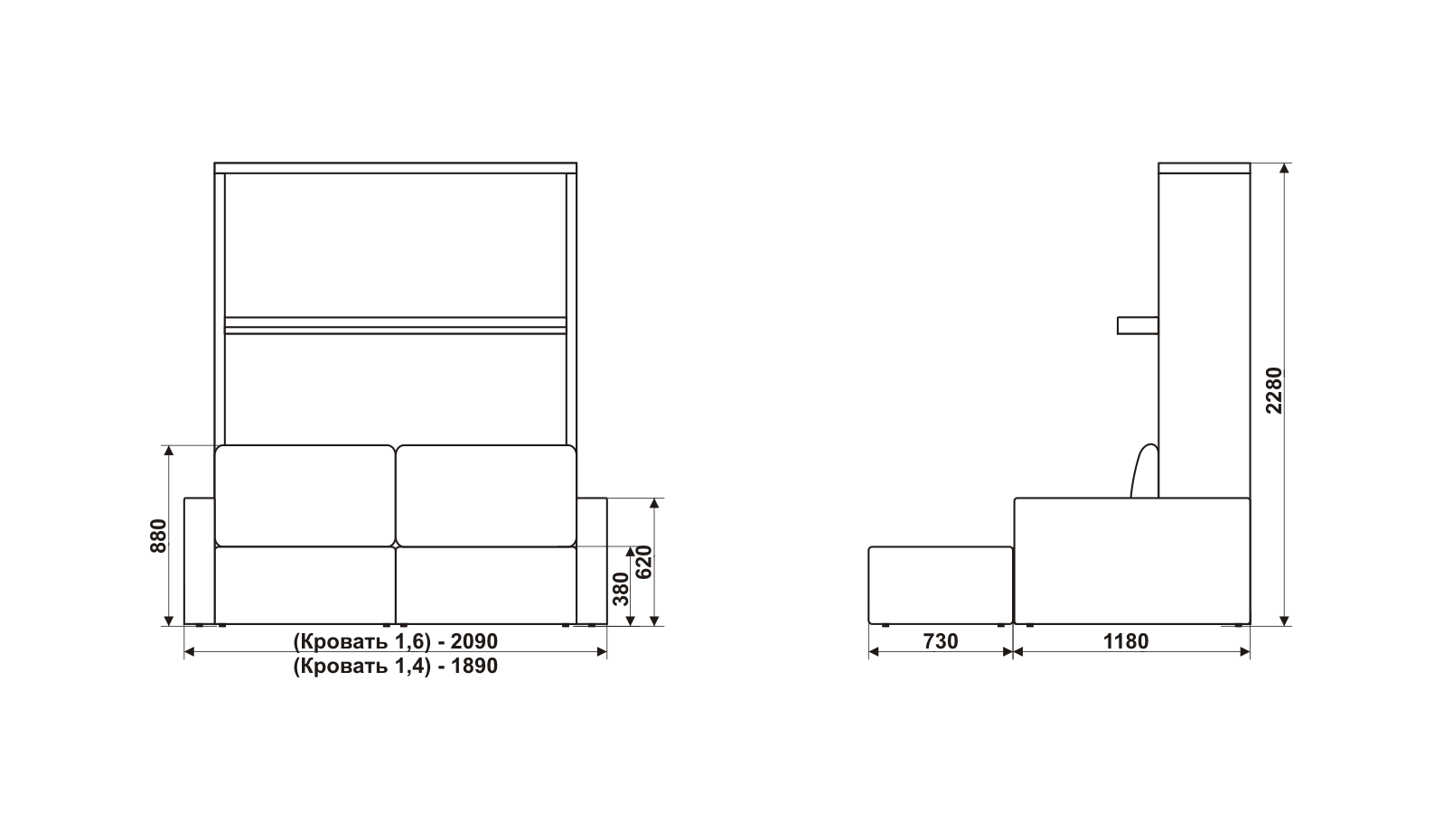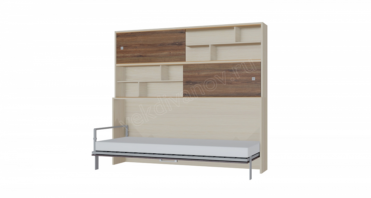 Каркас: Кровать состоит из короба, изготовленного в виде шкафа, выполнен из ЛДСП толщиной 16 мм и 22 мм может выполняться в разной цветовой гамме. Спальное ложе представляет собой металлический каркас - сварная труба 25х50 мм с ламелями. Для фиксации матраса в вертикальном положении, устройство дополняют ремнями. Полка состоит из короба, выполнена из ЛДСП толщиной 16 мм и 22 мм может выполняться в разной цветовой гамме.