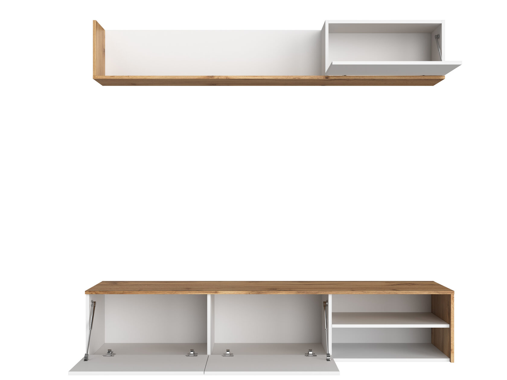 Комплектация: В комплект входят полка и тумба под ТВ, что обеспечивает удобное хранение и размещение различных предметов.