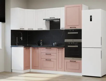 Аликанте 5: Цвет фасада: Шарли Pink, Шарли белый, корпус Серый, столешница 28мм: Каспий черное золото