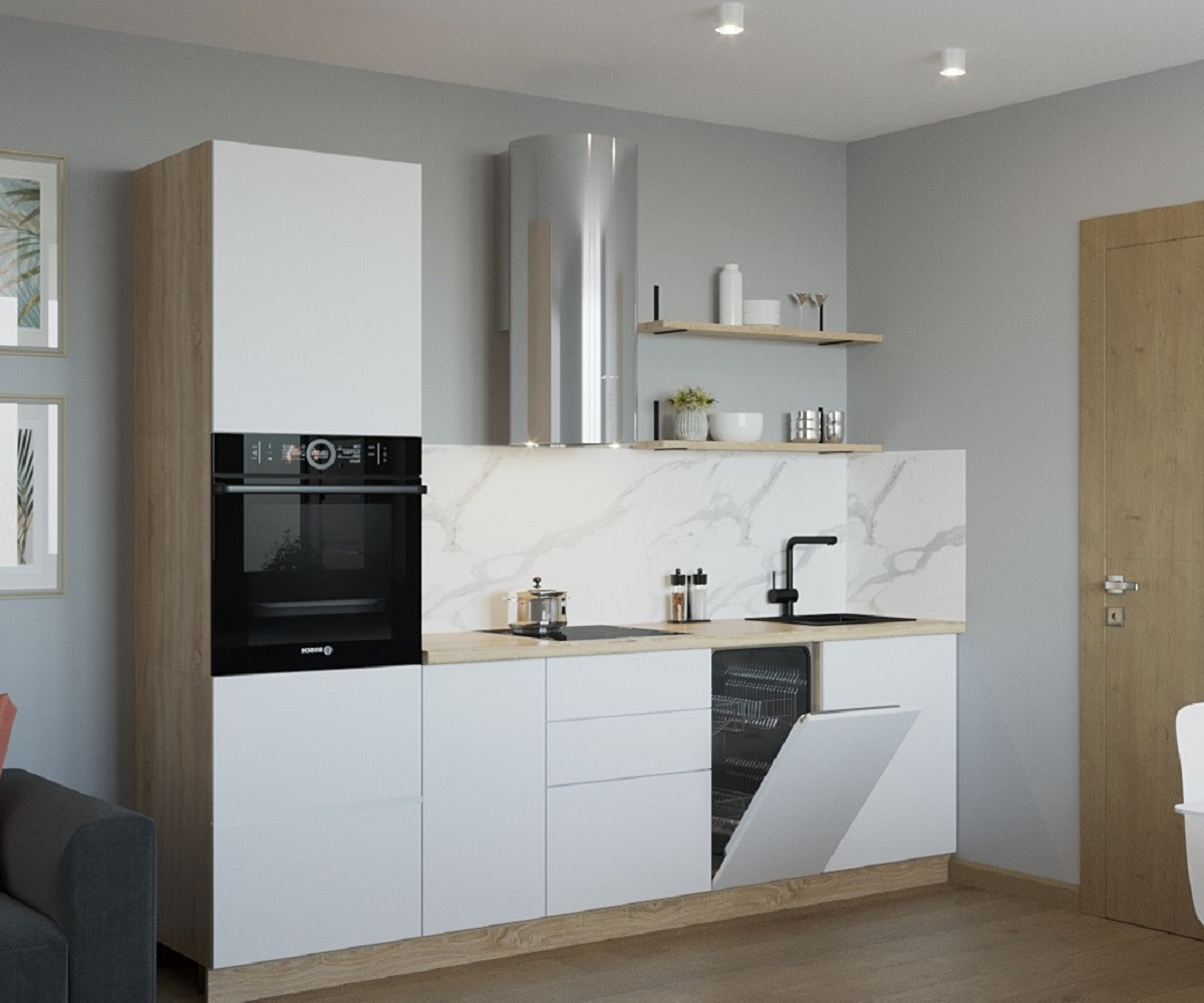 Матовые белые кухни — классика дизайна. Они практичны и универсальны, а сочетание с деревом идеально впишется в любой стиль: прованс, современная классика, минимализм.