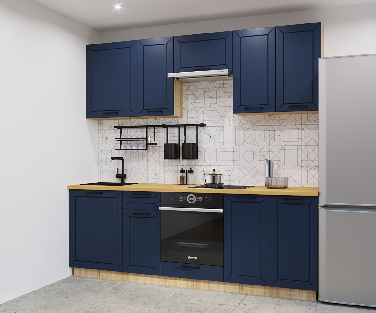 Синяя кухня всегда привлекает к себе восторженные взгляды, преображает окружающую обстановку и делает ее более легкой и свежей. Сдержанный и элегантный тандем в сочетании с грамотно расставленными яркими акцентами, будет смотреться очень уютно. Отличным компаньоном для синего станут корпус и столешница под светлое дерево.