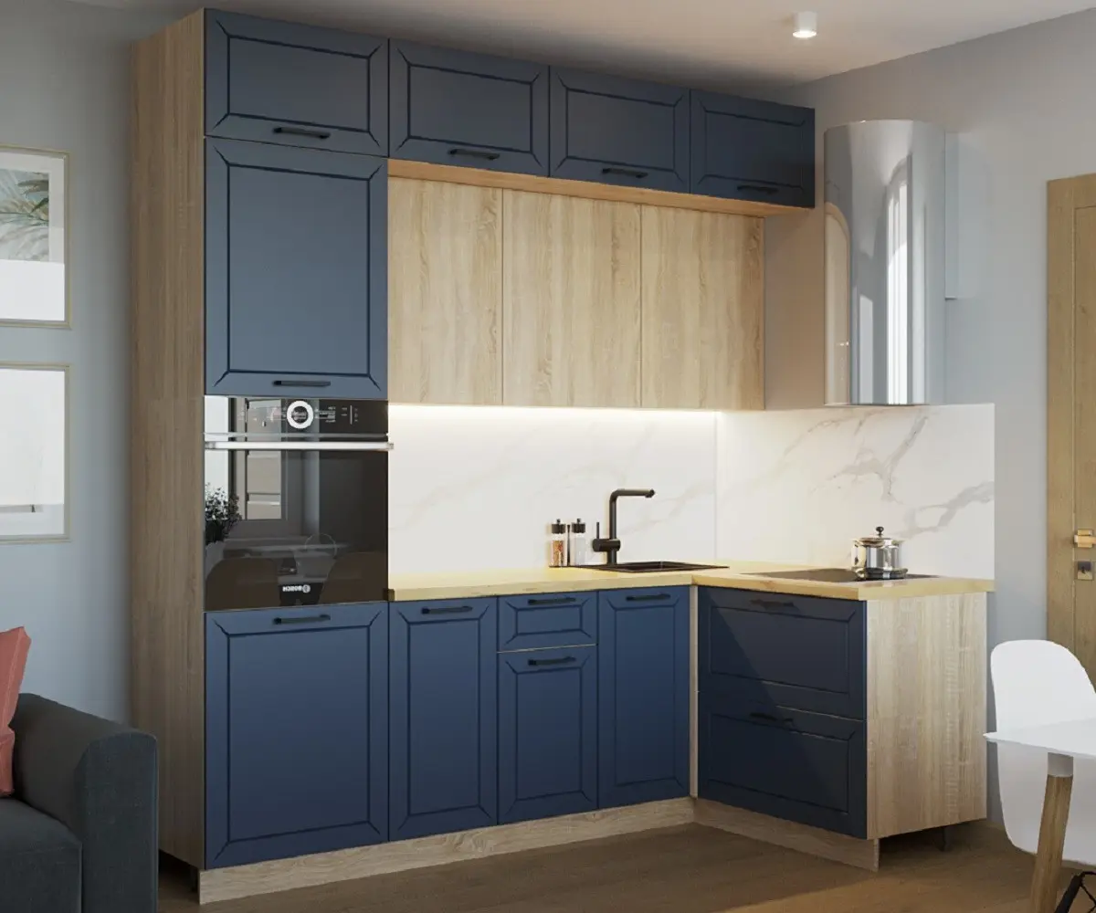 Синяя кухня всегда привлекает к себе восторженные взгляды, преображает окружающую обстановку и делает ее более легкой и свежей. Сдержанный и элегантный тандем в сочетании с грамотно расставленными яркими акцентами, будет смотреться очень уютно. Отличным компаньоном для синего станут корпус и столешница под светлое дерево.
