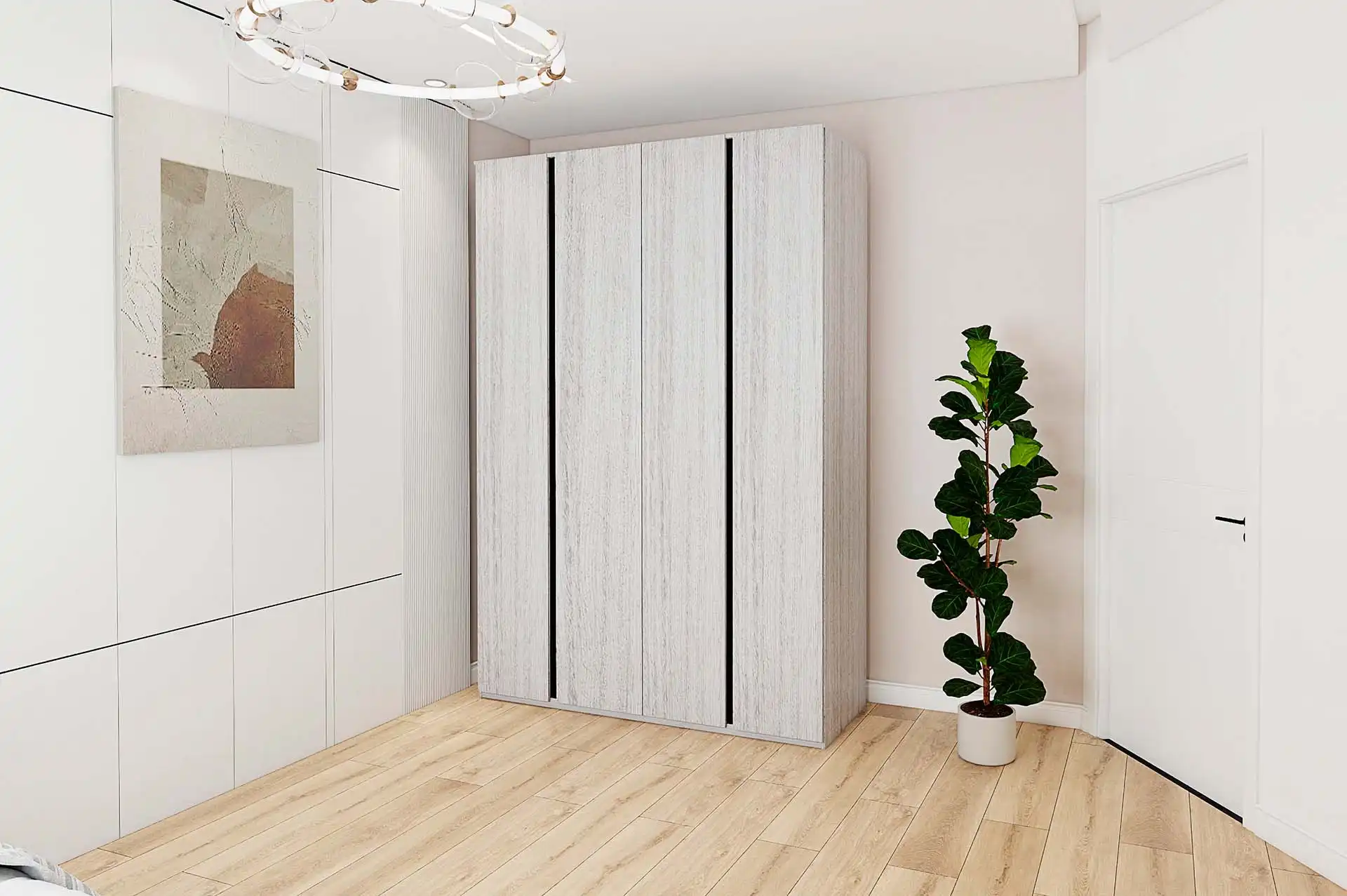 Этот современный шкаф представлен в трех трендовых цветах ЛДСП. Каждая из двух секций оснащена полками и штангами, что делает удобным использование шкафа для двух людей. Это стильное решение для совместного хранения одежды и аксессуаров.