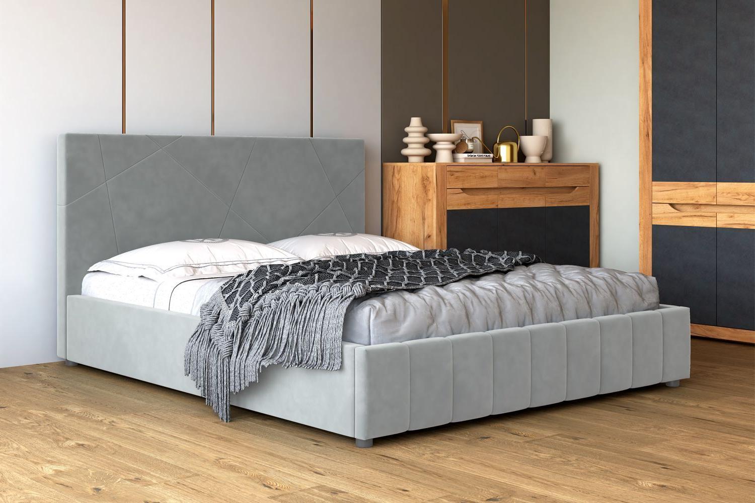 Кровать с мягким изголовьем Нельсон украшена стёжкографией в виде геометрического узора на спинке и изножье. Отделка придает декору строгости и лаконичности, а мягкая обивка - комфорта и роскоши. Интерьерная кровать Нельсон комплектуется металлокаркасом и дополнительно может быть оснащена подъемным механизмом с газовым амортизатором (газлифтом). Двуспальные мягкие кровати БРАВОмебель имеют надежный каркас из МДФ, фанеры и ЛДСП. В качестве наполнителя используются различные материалы, такие как холкон, поролон и периотек, которые обеспечивают мягкость, комфорт и долговечность изделия. Внешний слой обивки кровати выполнен из износостойкой качественной ткани.