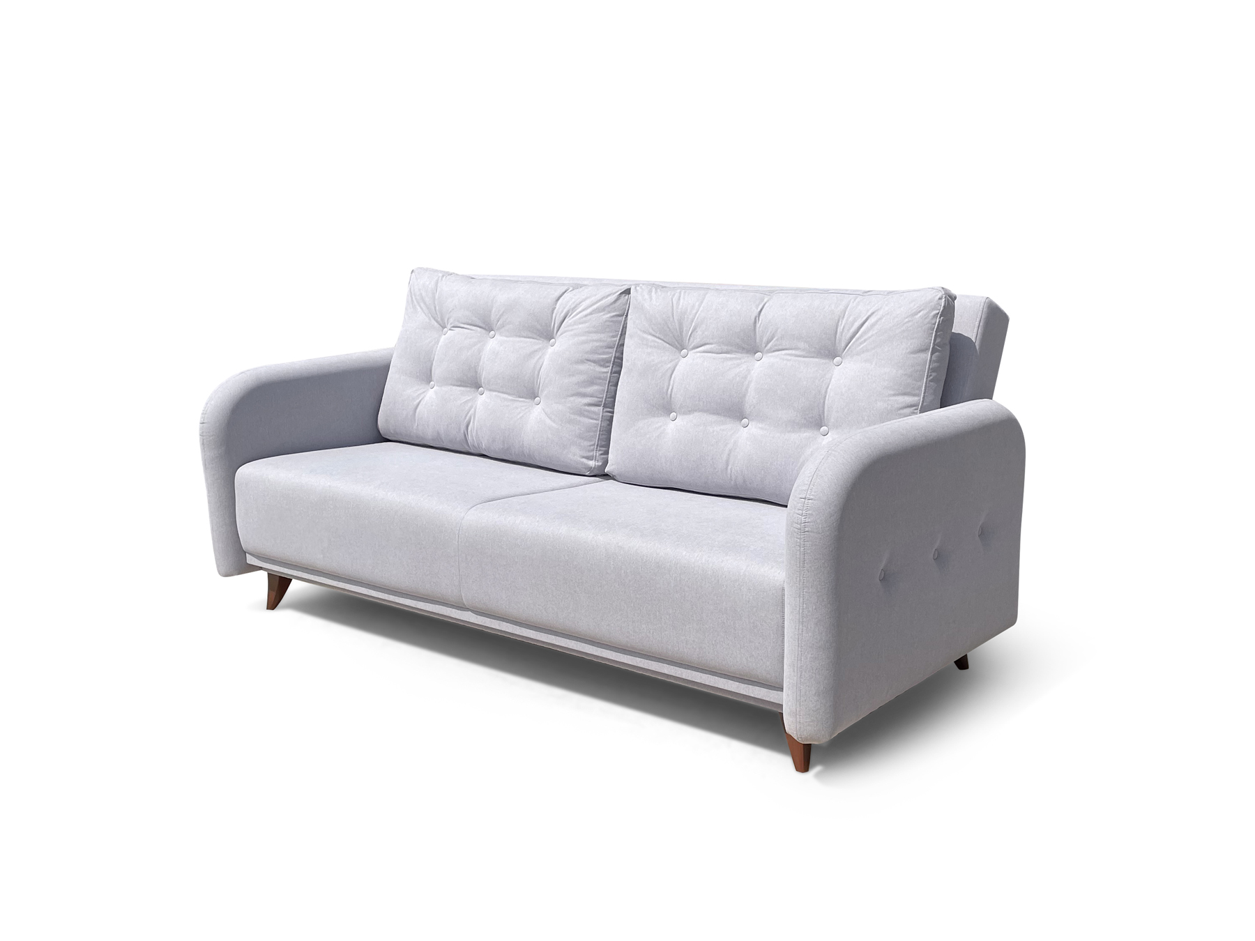 Диван в духе неоклассицизма, с различными вариантами подлокотников, отделки строчек и пуговиц, а также высокими ножками.