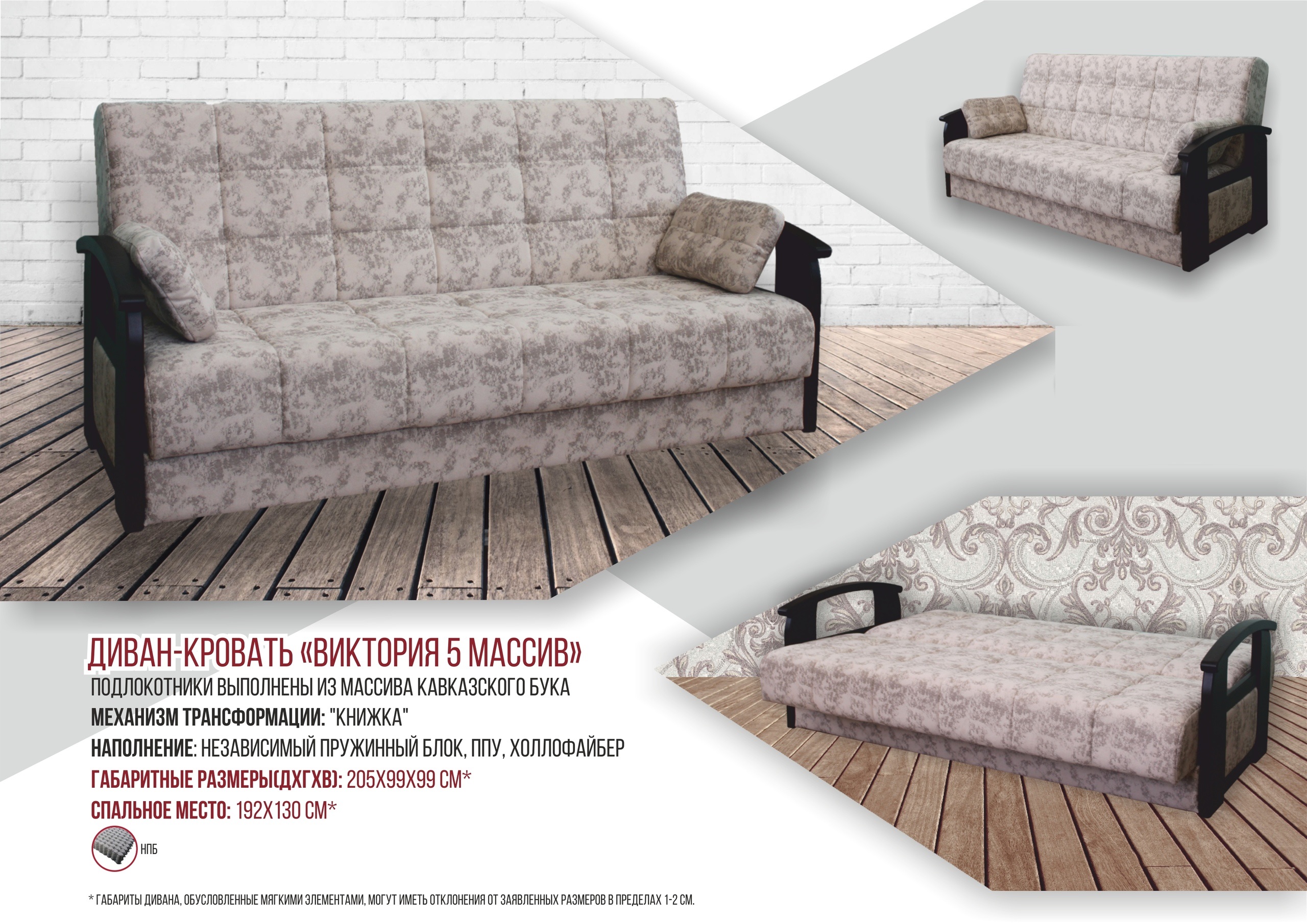 Подлокотники выполнены из массива кавказского бука. Механизм трансформации книжка. Независимый прожинный блок, ППУ, холлофайбер.